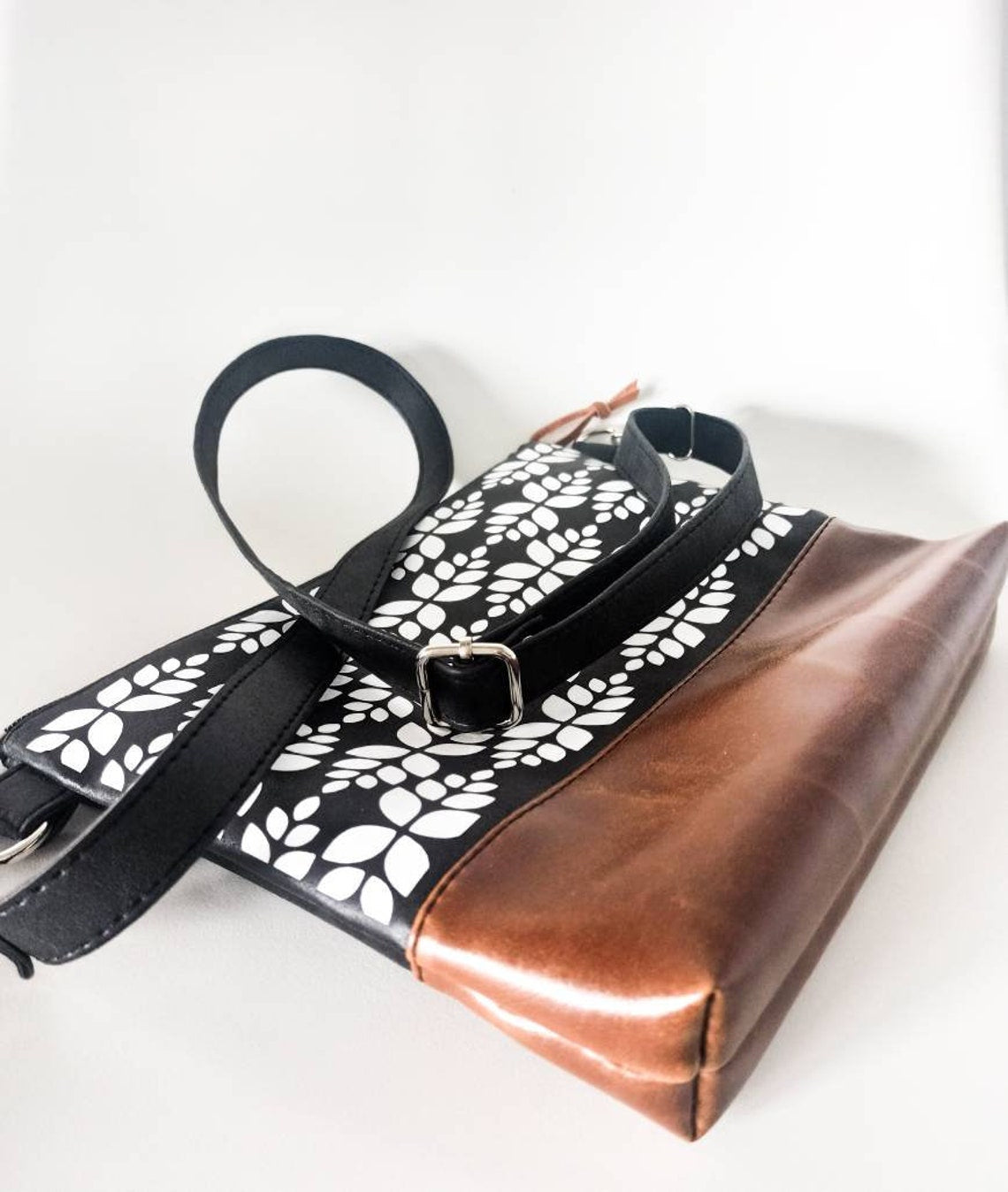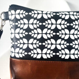 The upper part is in black with white leaves geometric pattern on one side. The other side is plain black. The material has nubuck leather texture.